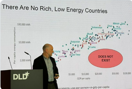 - “You can’t be a wealthy low energy country.” “Germany is in trouble. Germany produces less electricity in 2024 than in 1990.” — Albert Wenger of USV, showing the near perfect exponential correlation (log scale axes) between GDP and Energy Consumption at DLD in Munich.