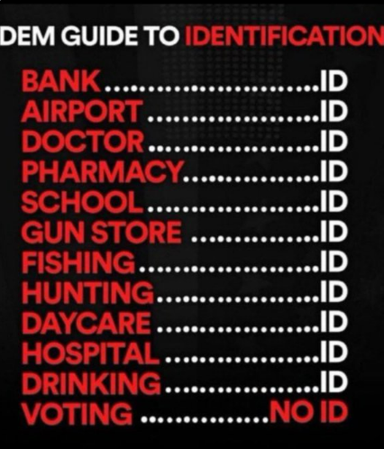• The big talking point for Dems is married women who change their name won’t be able to prove who they are. They’re actually serious about that. They really are counting on their voting base to be complete morons. Sadly most of them are.