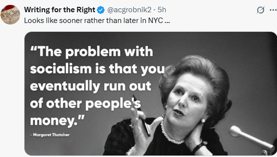 • Margaret Thatcher said, “The problem with socialism is that you eventually runout of other people’s money”. Also, “There’s no such thing as ‘safe’ socialism. If it’s safe it’s not socialism. And if it’s socialism, it’s not safe”. New Yorkers must unite and not vote for socialism. – Tiaggo