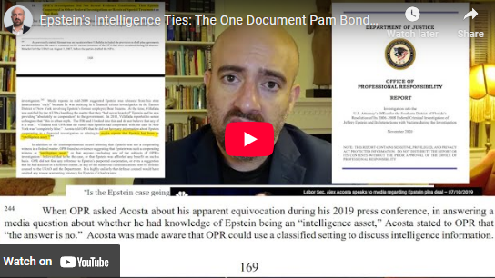 If Pam Bondi’s DOJ is serious about transparency around Epstein’s intelligence ties, the DOJ will immediately make public the DOJ OPR’s 2020 transcribed interview of Alex Acosta with its full set of questions about the intelligence issue, so we know exactly what was asked and answered. I’ll be posting a much longer, much more detailed video tomorrow, which will include all the additional DOJ and CIA leads for Pam Bondi’s team to pursue and make public the results of, in the full formal powerpoint presentation I’ve been preparing. – Mike Benz