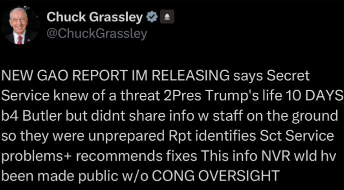 - [0] Grassley Report Concludes Secret Service Failure to Share Threat Information Allowed for Preventable Tragedy in Butler